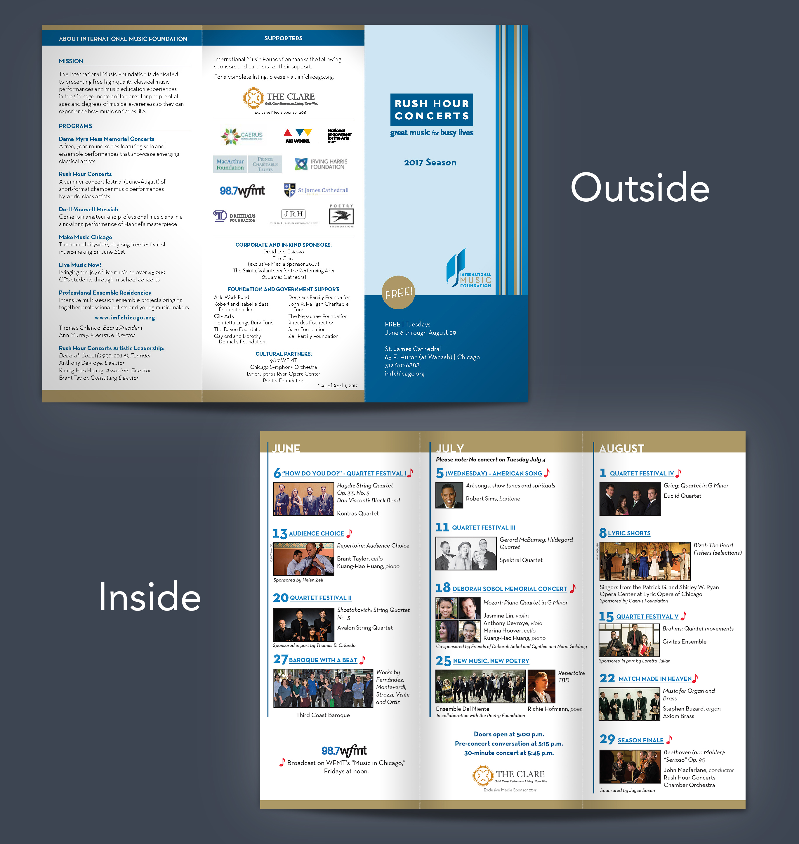 As part of my role as graphic designer at Performance Media I was asked to design and produce a trim-fold brochure for the client International Music Foundation IMF) Rush Hour Concerts following the corporate style guides. IMF approved my design and we produced these brochures for the Chicago Rush Hour Concerts series.