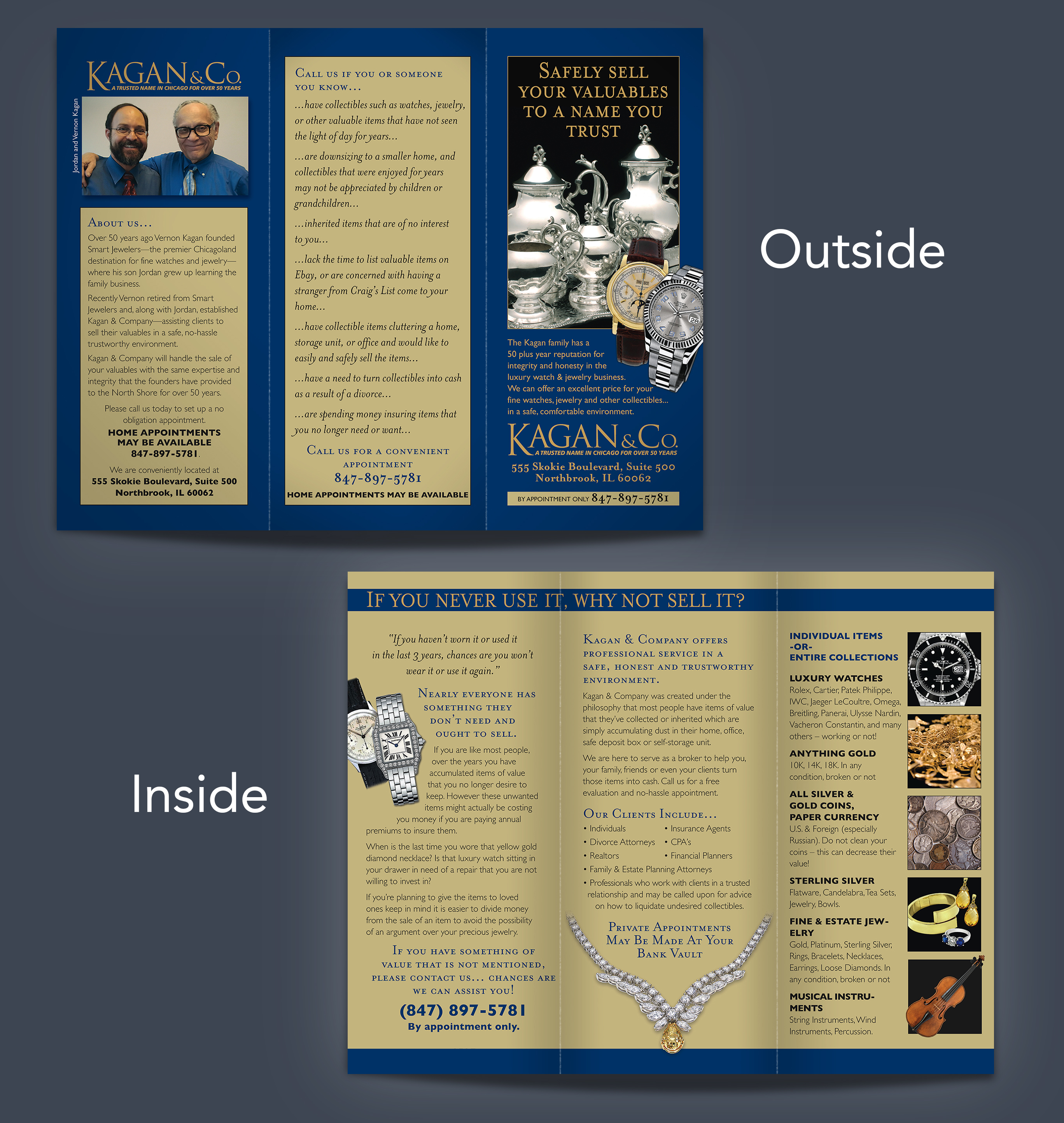 For this spin-off of Smart Jewelers, focused on buying and selling silver, jewelry, and collectibles, I developed a brochure designed for placement in jewelry stores and consignment shops. I handled the project end-to-end—writing the copy, photographing select items, sourcing supporting imagery, and designing and producing a piece that clearly communicates the brand and its services.