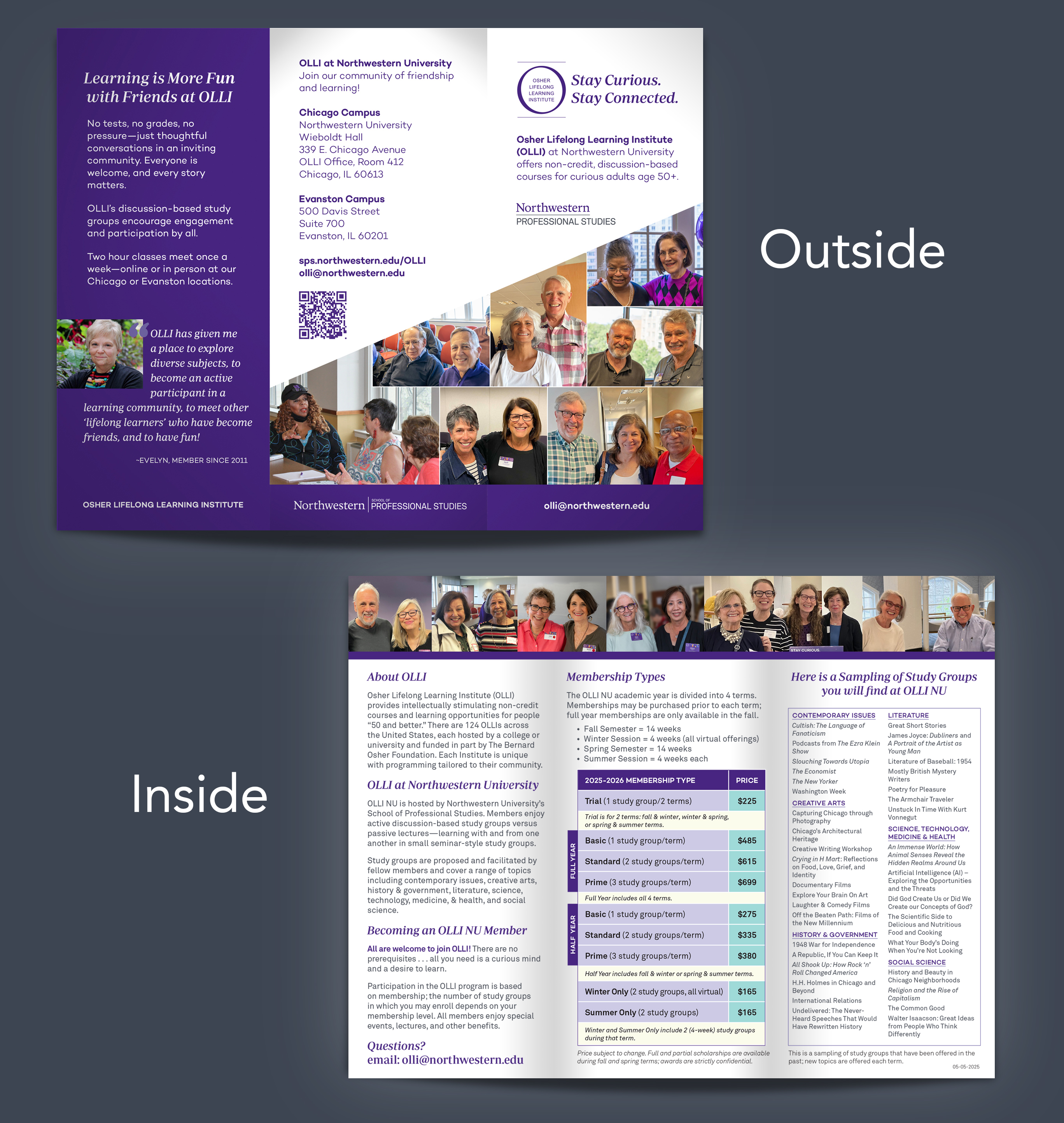 At the Osher Lifelong Learning Institute (OLLI), where word of mouth is the primary driver of new member recruitment, I identified the need for a shareable, member-focused brochure. I wrote the copy and led the design and production of this piece—keeping to Northwestern standards and specs—creating a polished, accessible resource that members can easily pass along to prospective participants. The brochure also serves as a key asset for outreach and tabling events.
